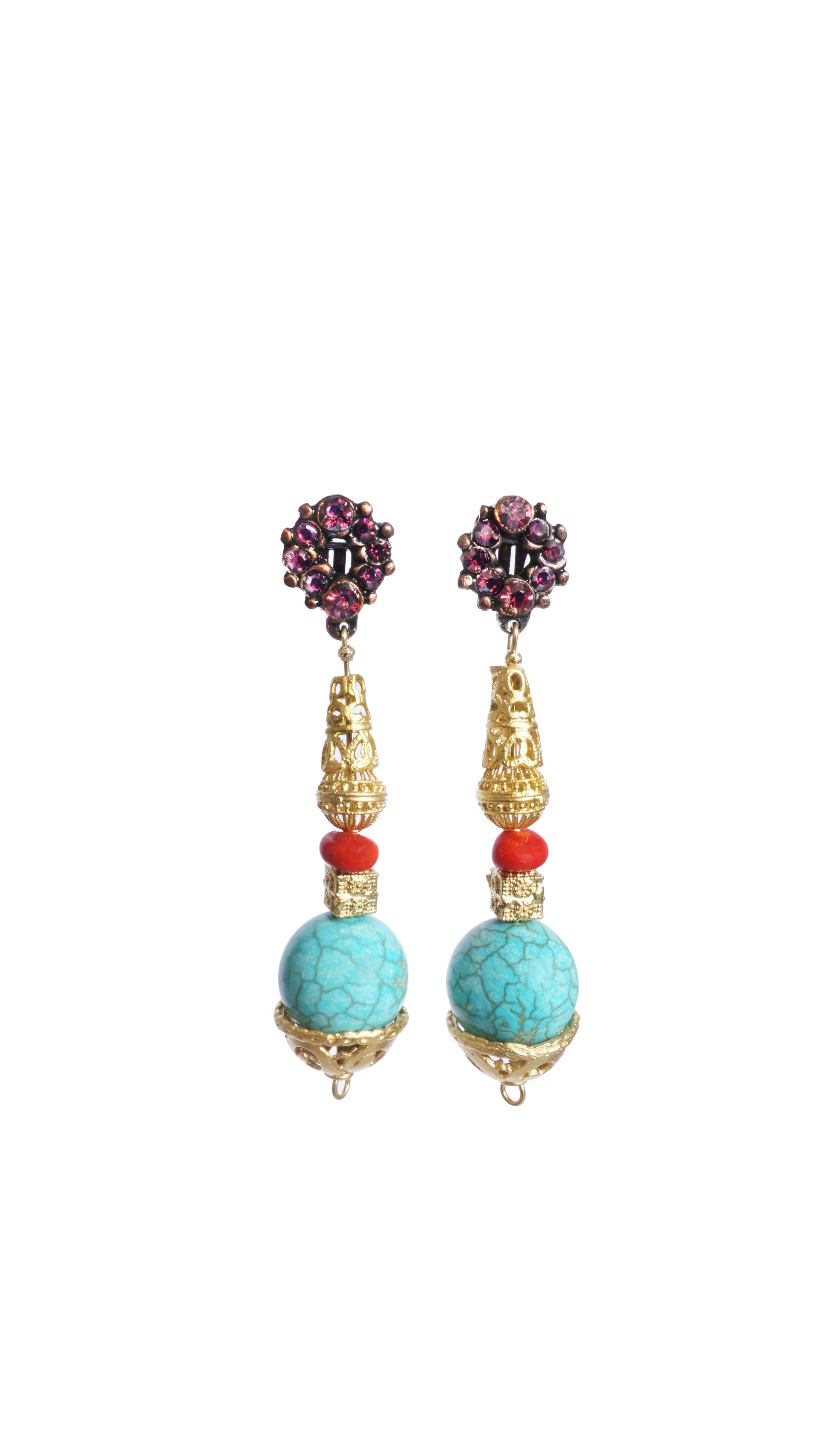 Diese vergoldeten Statement-Ohrclips vereinen dunkellilane Swarovski-Steine, eine leuchtende Türkis-Perle und eine intensive rote Glasperle zu einem kraftvollen, sinnlichen Design.