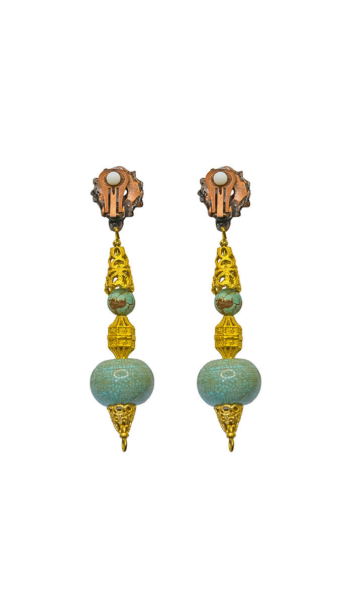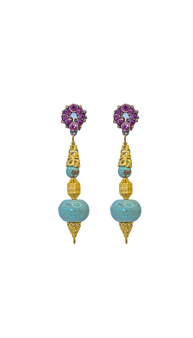 Ein Schmuckstück voller Magie: Diese ausdrucksstarken Ohrclips sind im Schleudergussverfahren gefertigt und mit tief violetten Swarovski-Steinen besetzt. Die Hänger bestehen aus echten türkisfarbenen Halbedelsteinen, kombiniert mit aufwendig verzierten 18 Karat vergoldeten Zwischenelementen. Feminin, edel, spirituell.