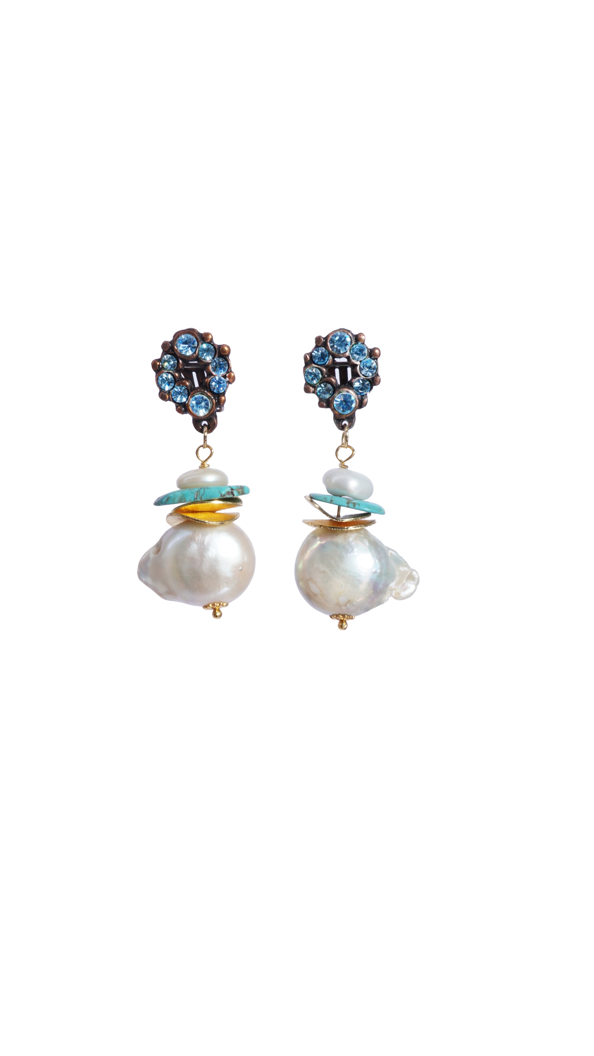 Diese edlen Ohrclips vereinen hellblaue Swarovski-Steine, eine kleine Süßwasserperle, vergoldete Elemente sowie einen leuchtenden Türkis-Halbedelstein zu einem harmonischen Farbspiel. Den Abschluss bildet eine prachtvolle Barockperle – einzigartig in Form und Wirkung.