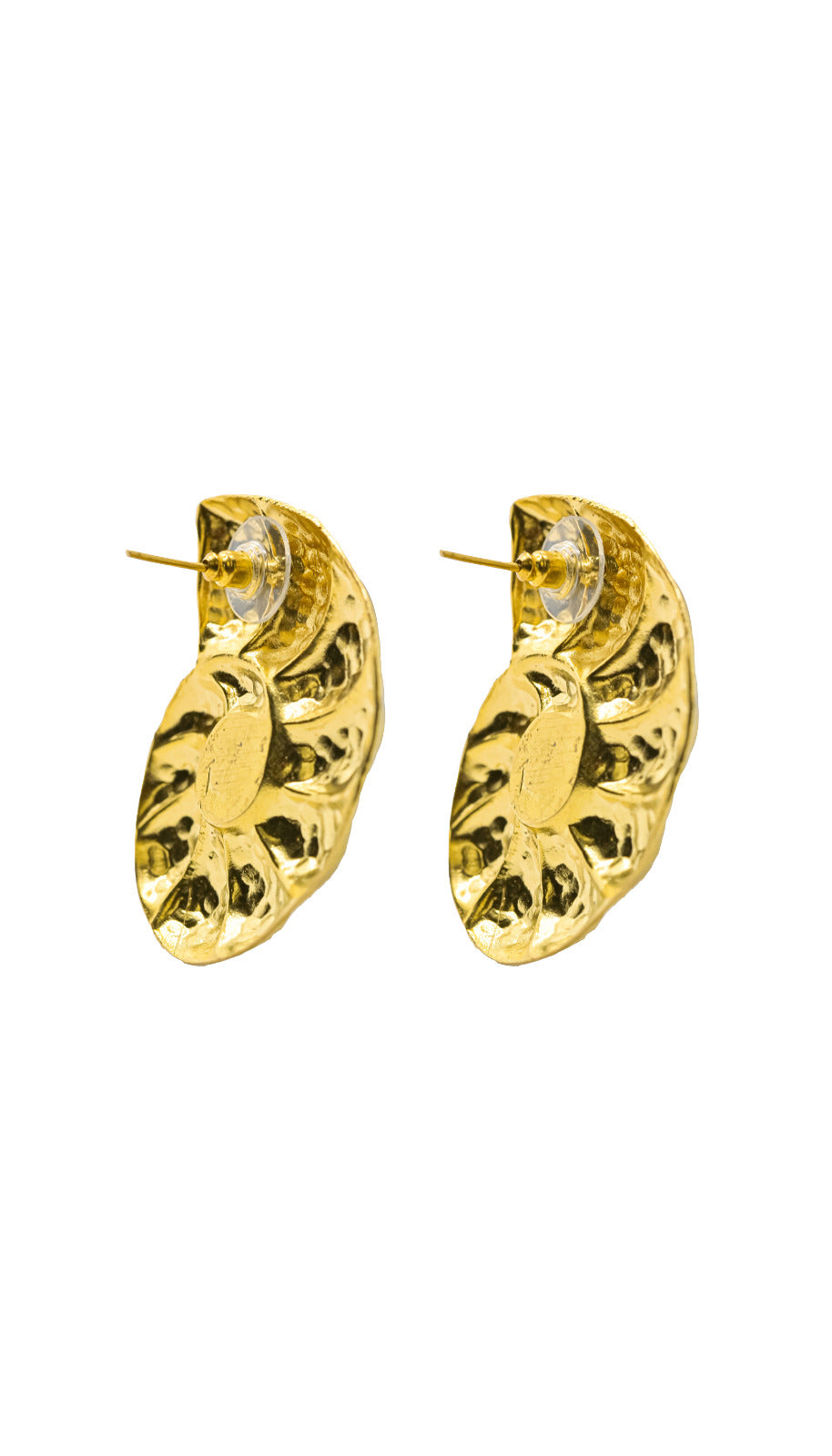 Diese ausdrucksstarken Ohrringe in stilisierter Muschelform wurden im Schleudergussverfahren gefertigt, mit 18 Karat vergoldet und mit einem facettierten, grauen Halbedelstein im Zentrum veredelt. Ein maritimes Statement mit zeitlosem Glanz.