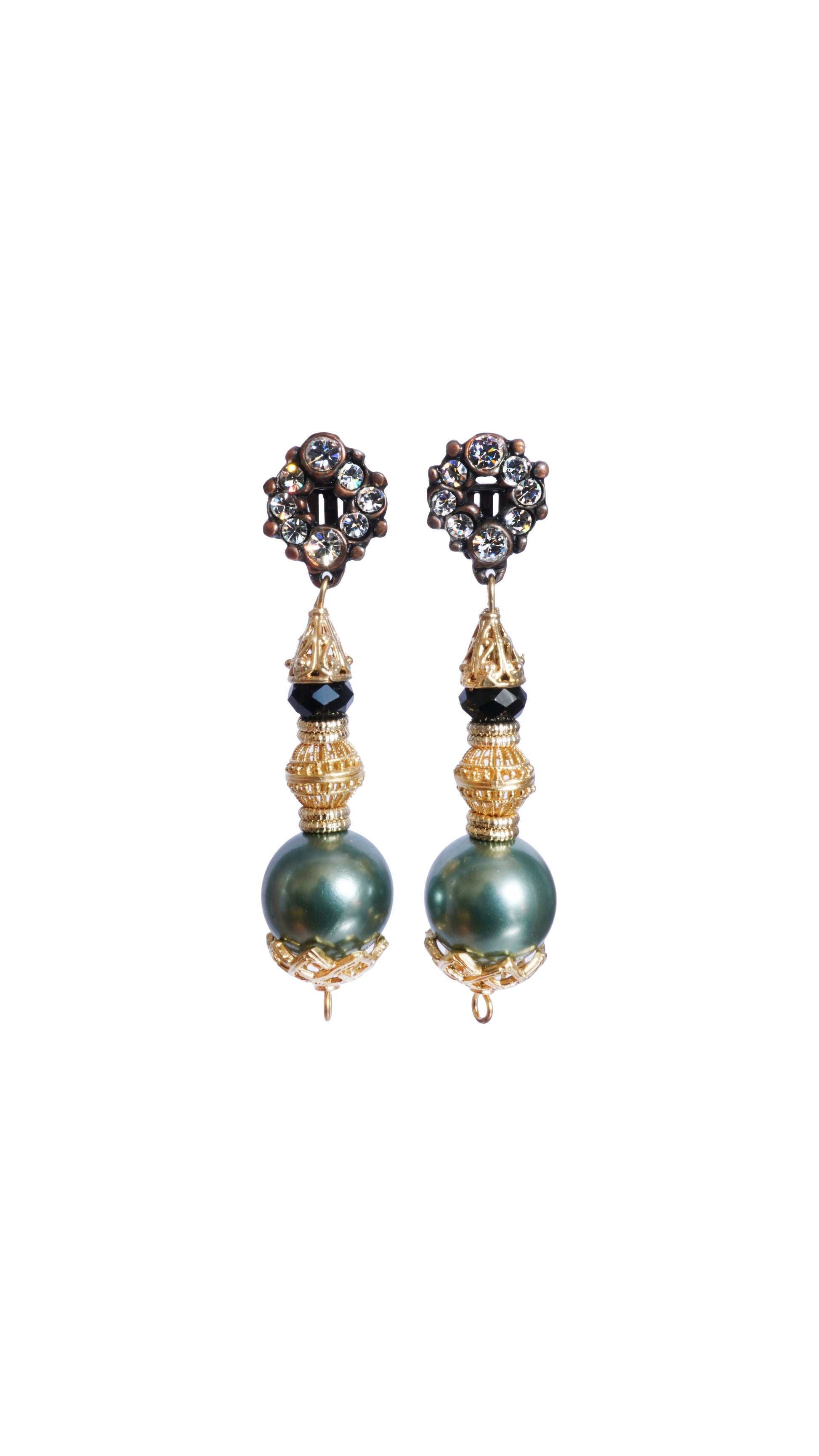 Diese edlen Ohrclips kombinieren funkelnde weiß-silberne Swarovski-Steine, vergoldete Zwischenelemente, einen tiefschwarzen Opal-Halbedelstein und eine schimmernde anthrazitfarbene Mallorca-Perle.