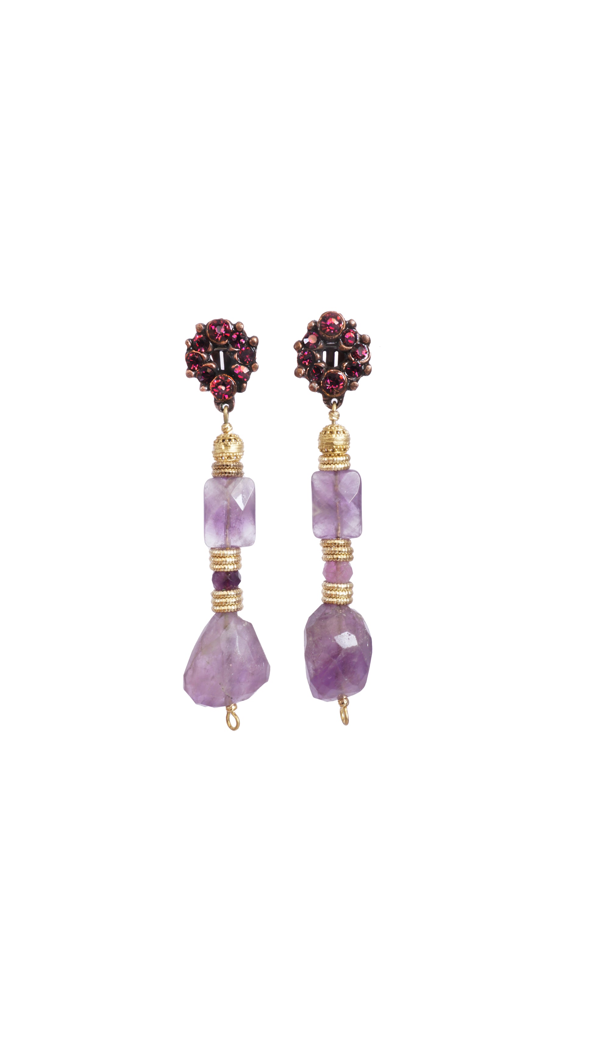 Diese luxuriösen Ohrclips kombinieren tief lilafarbene Swarovski-Steine mit facettierten Amethyst-Halbedelsteinen und vergoldeten Details.