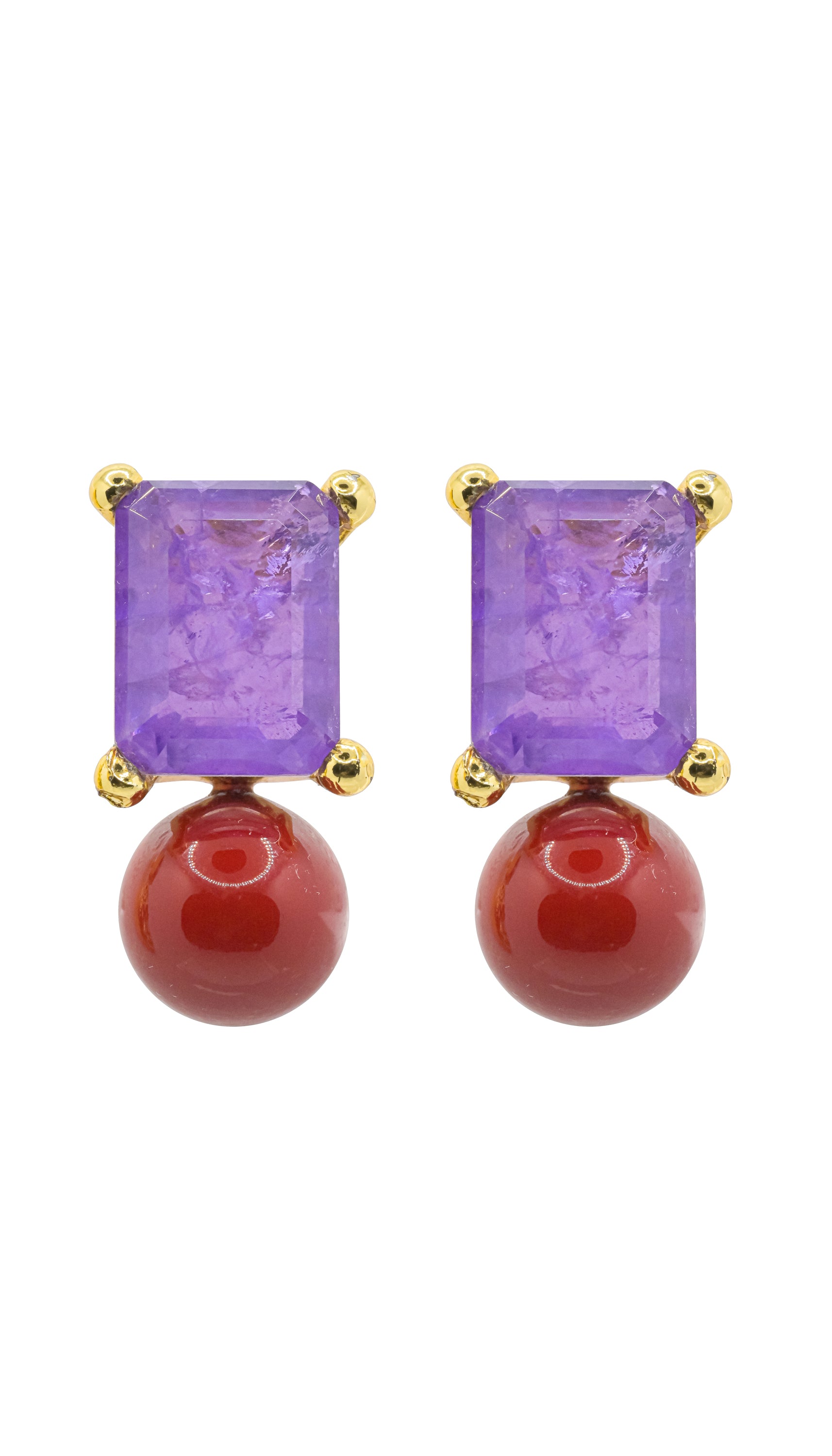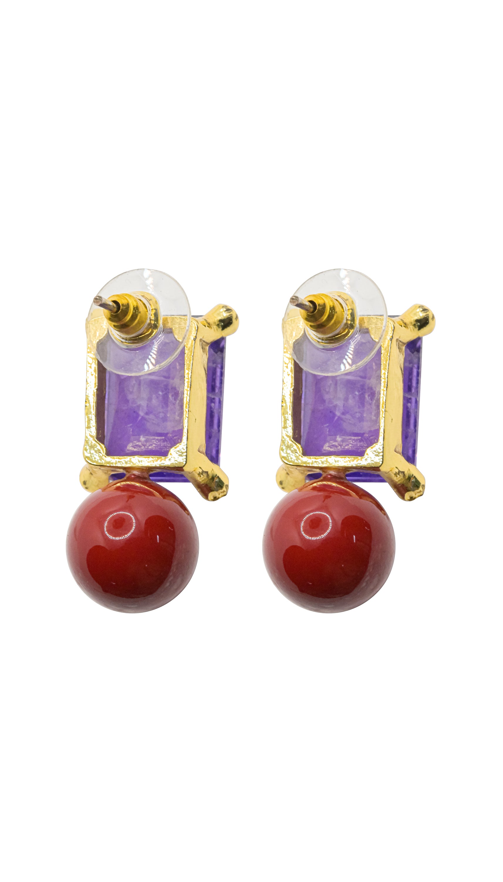Diese besonderen Ohrstecker verbinden klare Linien mit kraftvollen Edelsteinenergien. Gefertigt aus hochwertigem Schleuderguss und vergoldet, kombinieren sie einen facettenreichen, violetten Ametyst-Halbedelstein im eckigen Schliff mit einer runden, intensiv roten Korallenkugel.