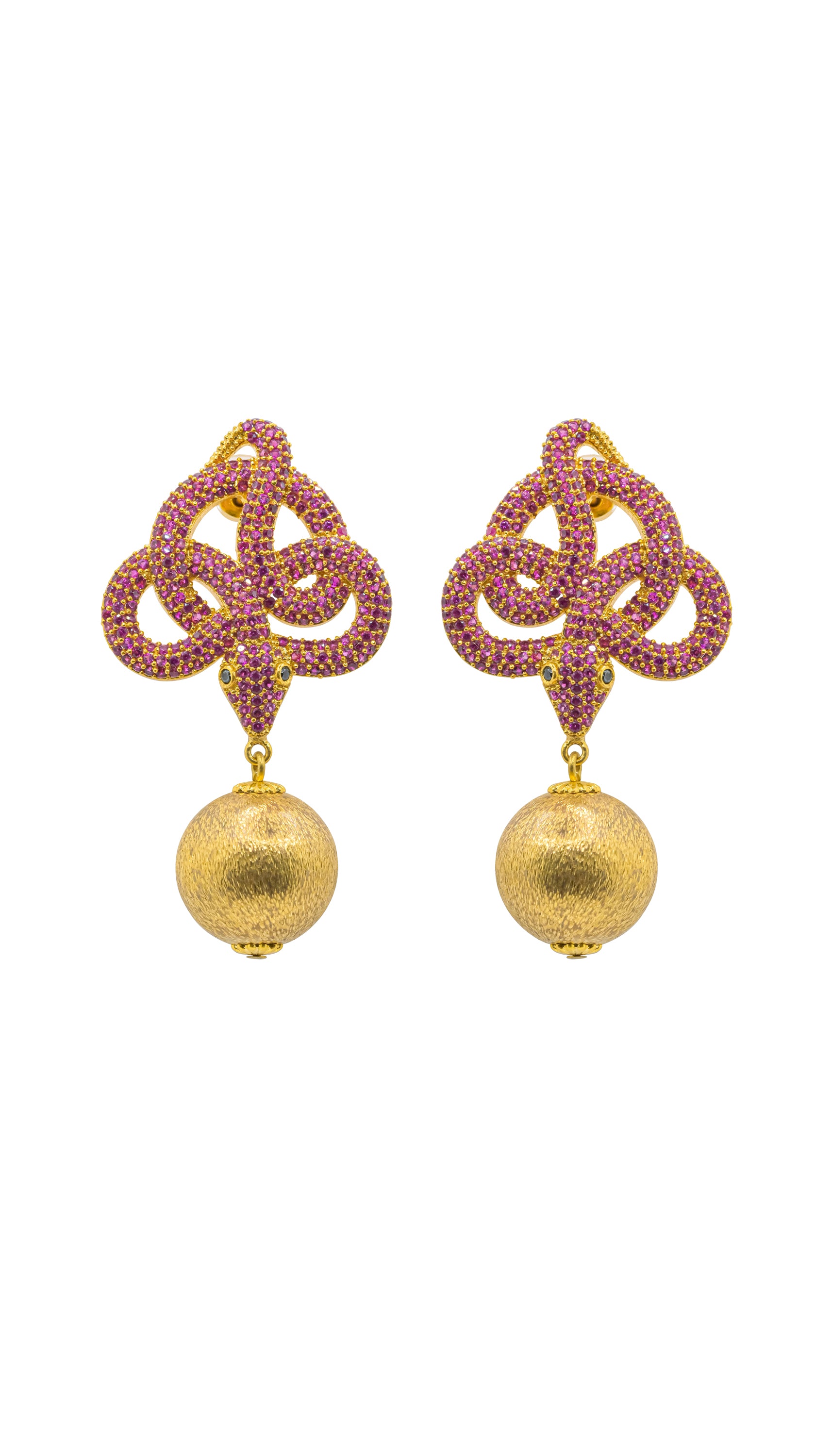 Diese ausdrucksstarken Ohrstecker wurden im Schleudergussverfahren gefertigt und mit unzähligen funkelnden pinken Swarovski-Steinen besetzt. Die filigrane, verschlungene Form erinnert an eine Schlange – ein Symbol für Transformation und feminine Kraft.