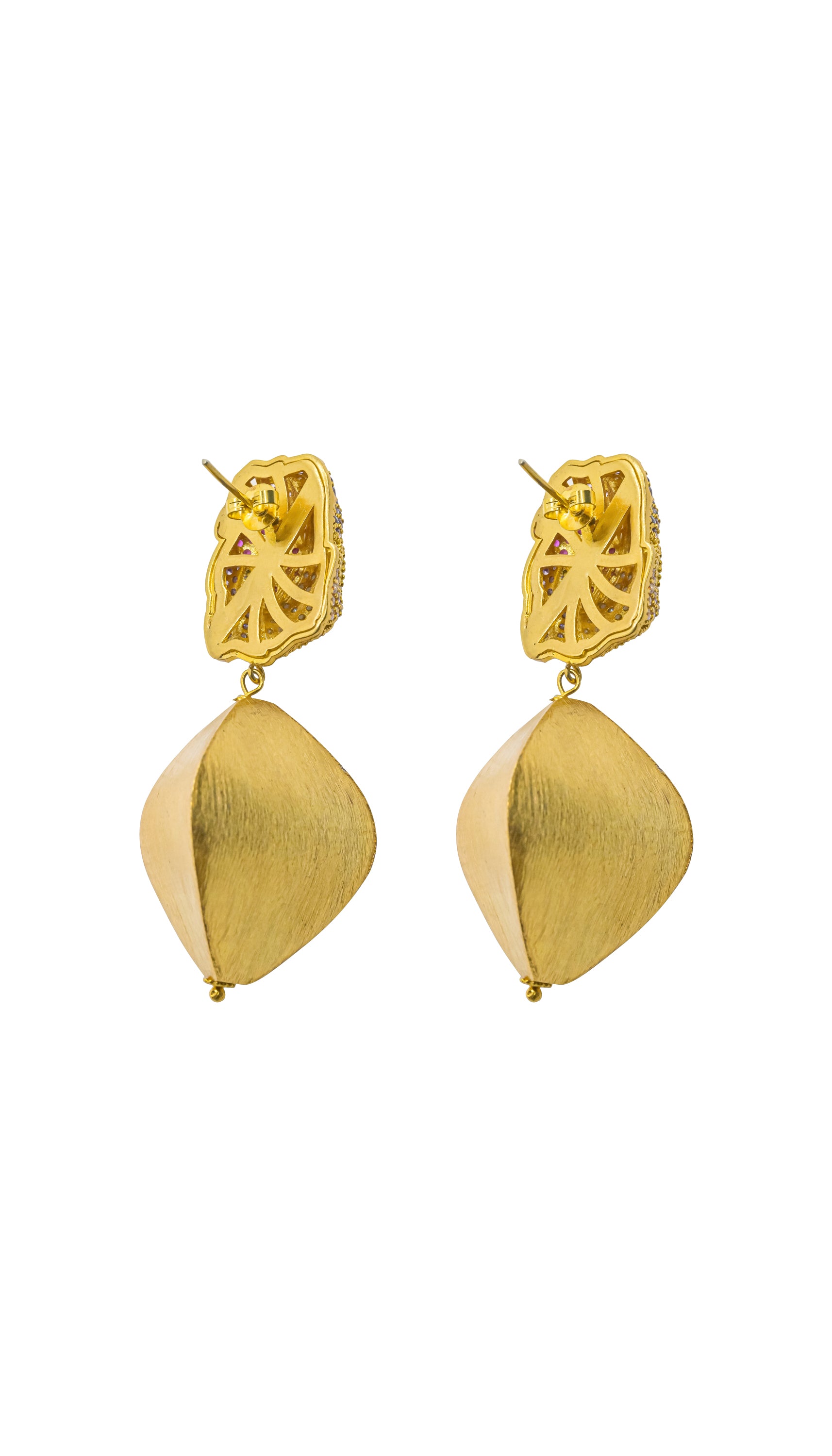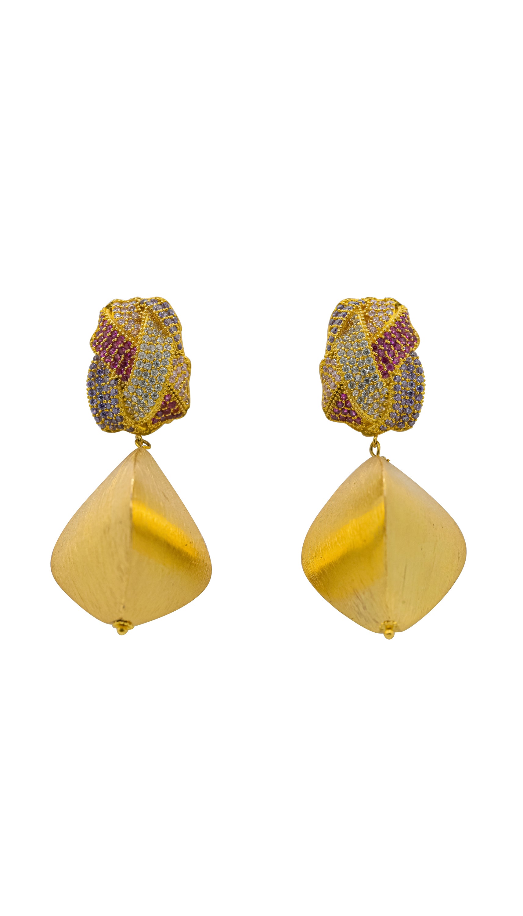 Das geflochtene Oberteil bildet mit seinen funkelnden Farbsteinen das Highlight des Designs und erinnert an luxuriöse Textilkunst. Der geometrisch geformte, goldene Anhänger rundet den Look mit moderner Eleganz ab. Leuchtkraft und Form in perfekter Balance – ein Ohrschmuck für echte Statements.
