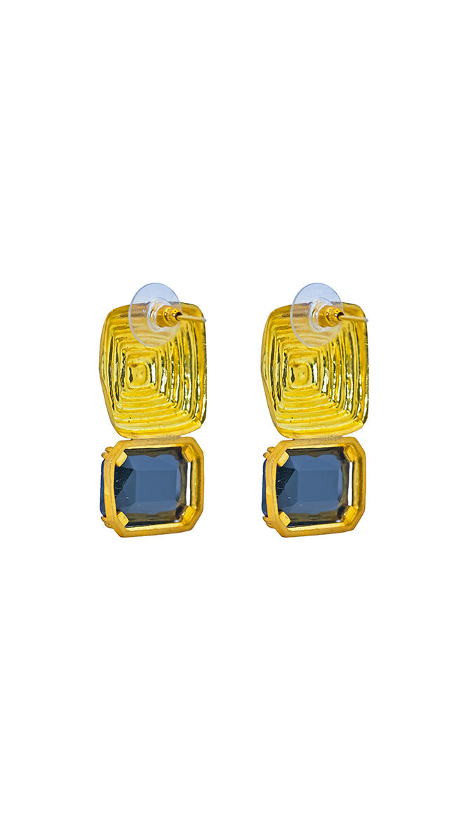 Moderner Spiral-Ohrstecker in viereckiger Form – 4 cm lang, 2 cm breit – im Schleudergussverfahren gefertigt und 18 Karat vergoldet. Veredelt mit einem tiefschwarzen, facettierten Swarovski-Stein. Klar. Geometrisch. Ausdrucksstark.