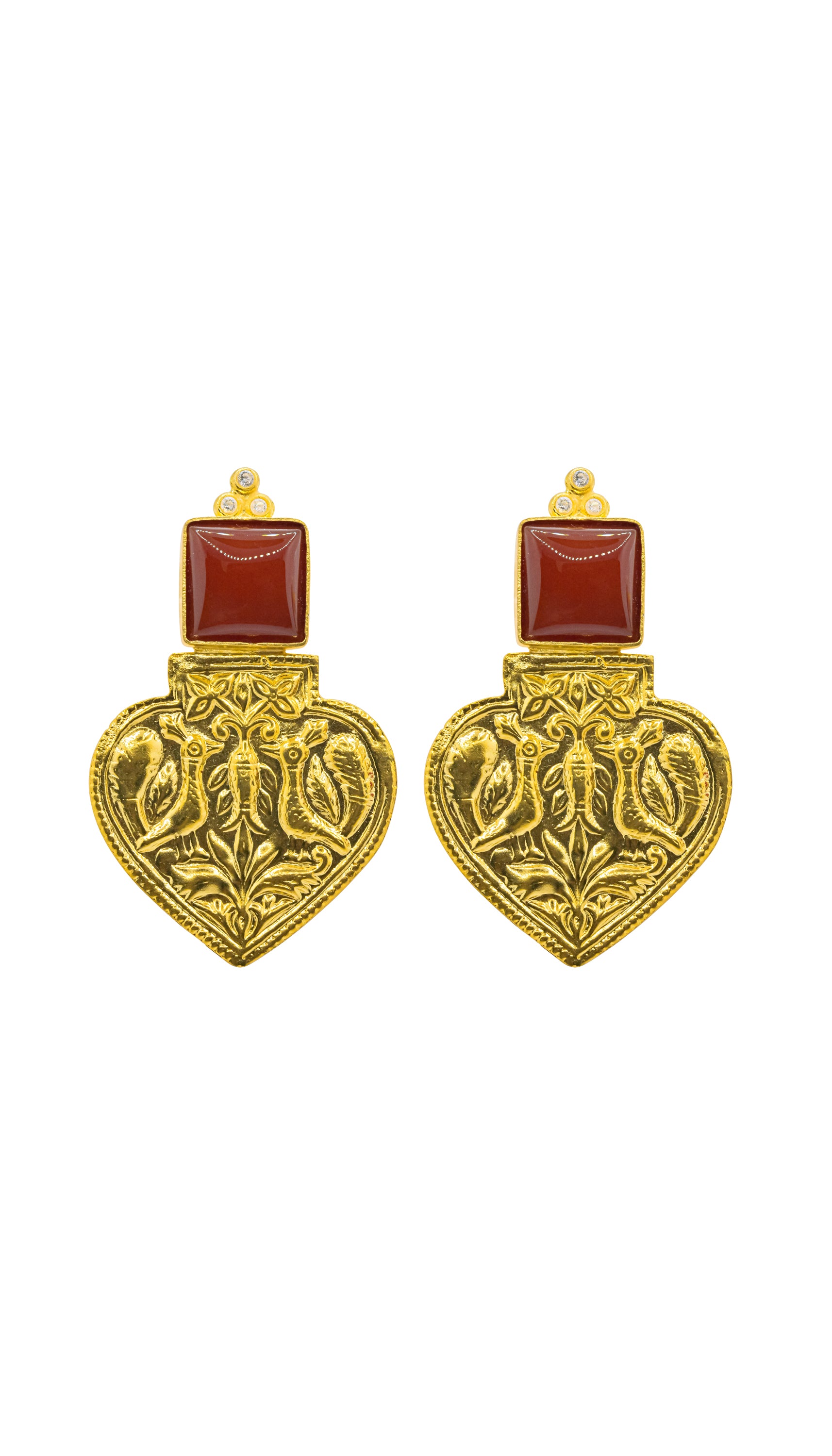 Der quadratisch geschliffene Charneol-Halbedelstein in warmem braunrot sitzt auf einer reich verzierten Herzform aus hochwertigem Schleuderguss. Die goldene Oberfläche ist mit filigranen Tier- und Pflanzenmotiven versehen – ein Design, das Geschichten aus 1001 Nacht erzählt.